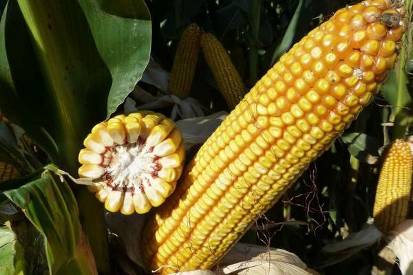 4、果穗筒型,穗轴紫红色,穗长23—26厘米,穗粗5.1—5.8厘米,穗行数18-20行,籽粒半马齿型,籽粒黄色,粒长轴细,百粒重40克,出籽率85.7%。