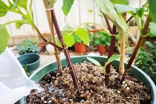 换盆处理:栽种大丽花每年都要换一次盆,在盆底垫入碎瓦片作为沥水层,然后加入培养土,换盆后浇水保湿。