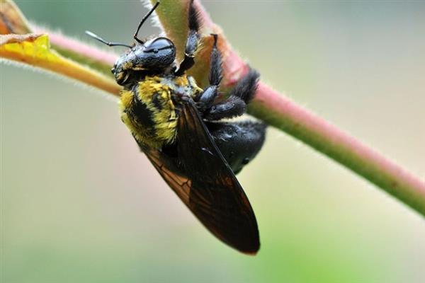 (2)工蜂有2种类型,一种是几丁质全部呈黑色,另一种是第2、3两腹节背板两侧有较小的黄斑,胸部背板上的绒毛为黄褐色。雄蜂只有一种黑的体色,腹部1-5节背板的后缘皆有褐色光泽的边沿,最末节为黑色。