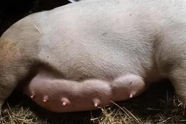 (1)在分娩前两周,母猪乳房由后向前逐渐膨大,在乳房基部与腹部之间会有明显的界限。